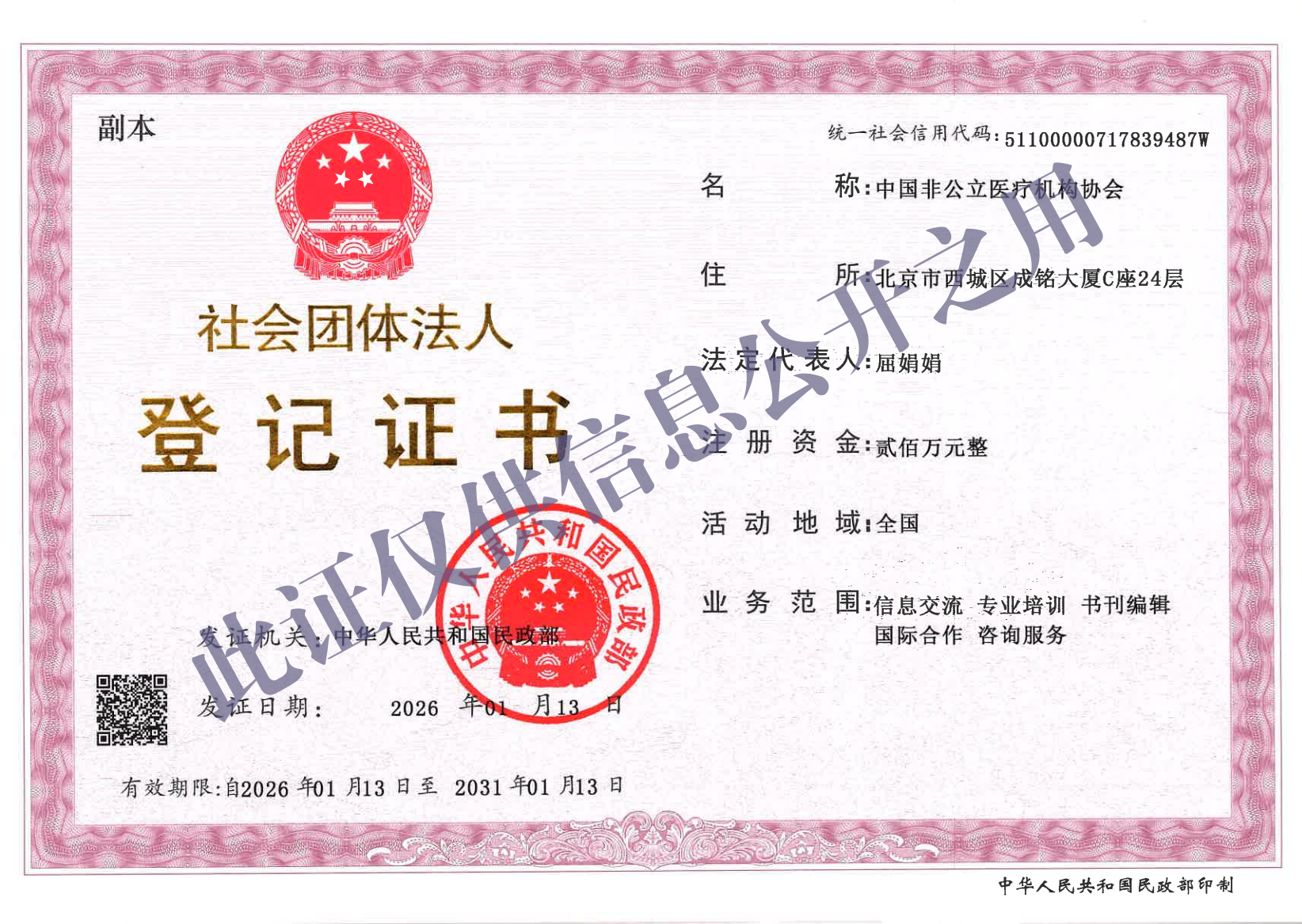 中国非公立医疗机构协会是由依法获得医疗机构执业许可的非公立医疗机构、相关企事业单位和社会团体等有关组织和个人自愿结成的全国性、行业性、非营利性社会组织。