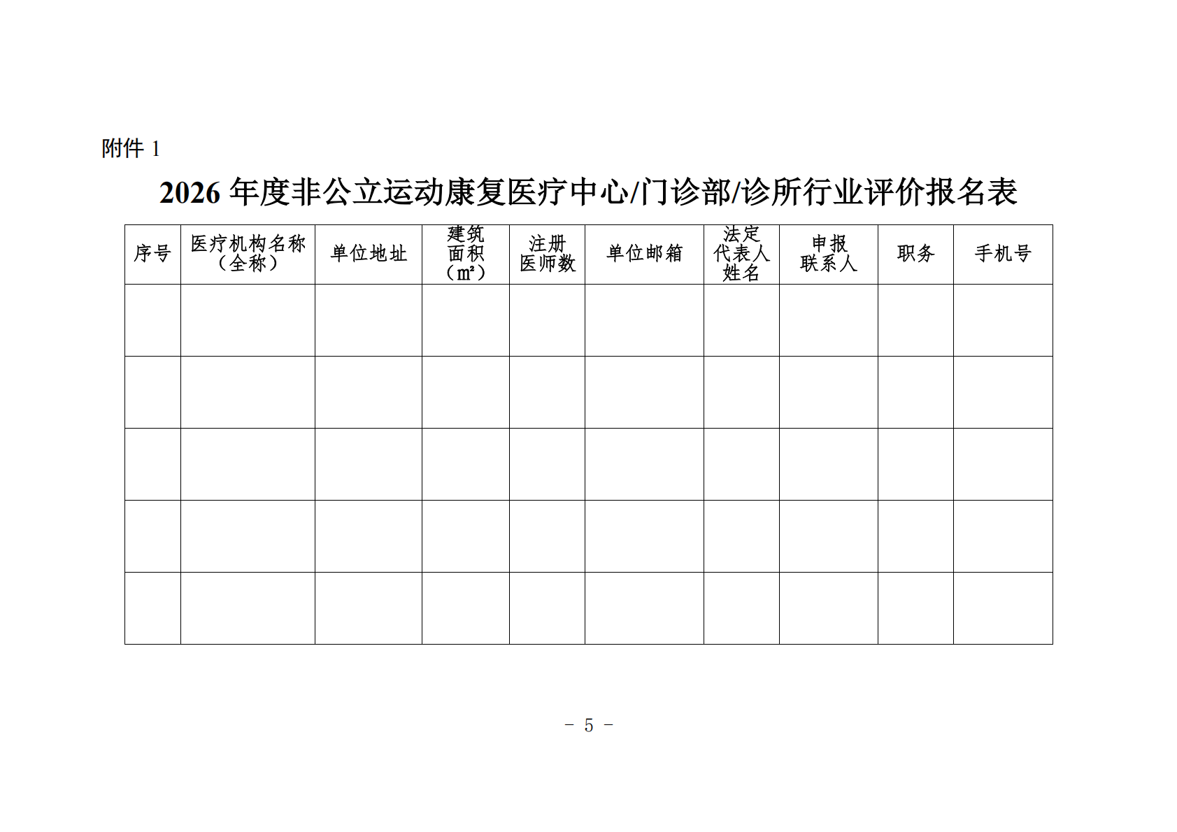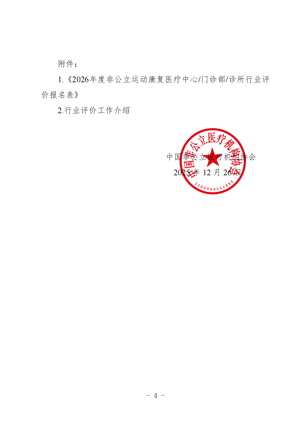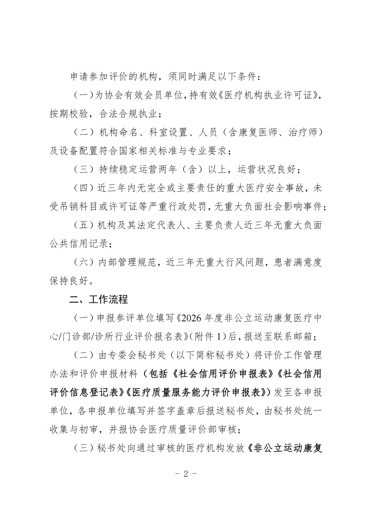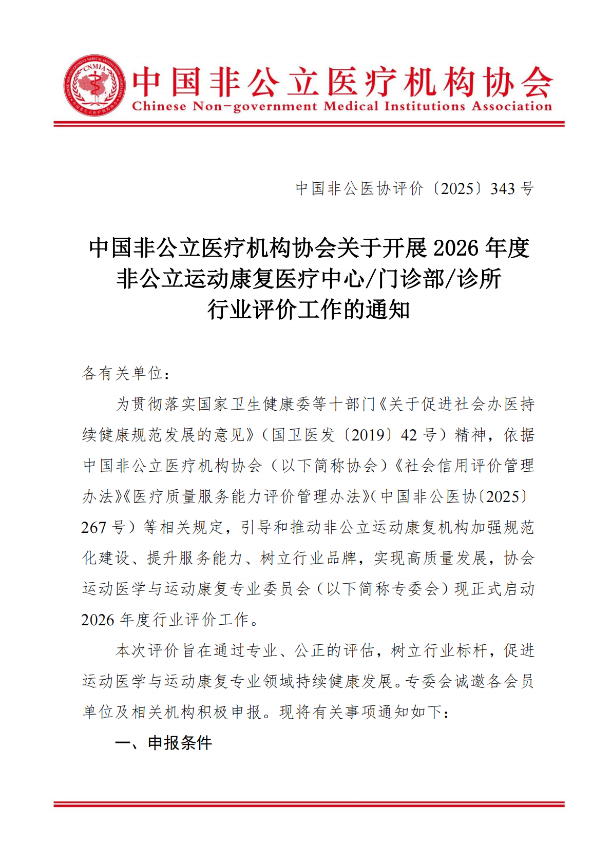 中国非公立医疗机构协会关于开展 2026 年度非公立运动康复医疗中心/门诊部/诊所行业评价工作的通知