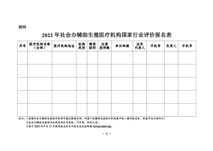 ↓附件:《2022年社会办辅助生殖医疗机构国家行业评价报名表》