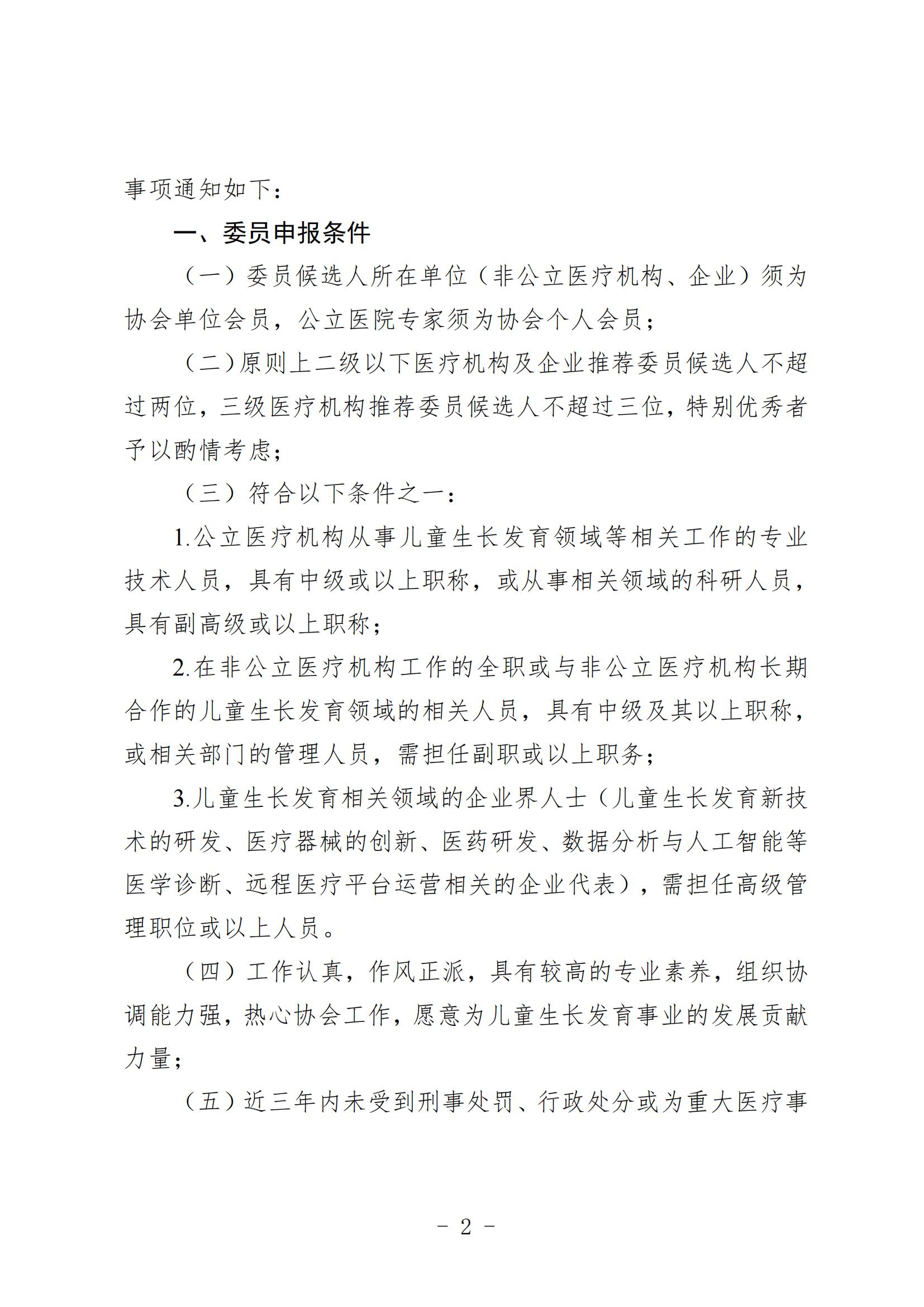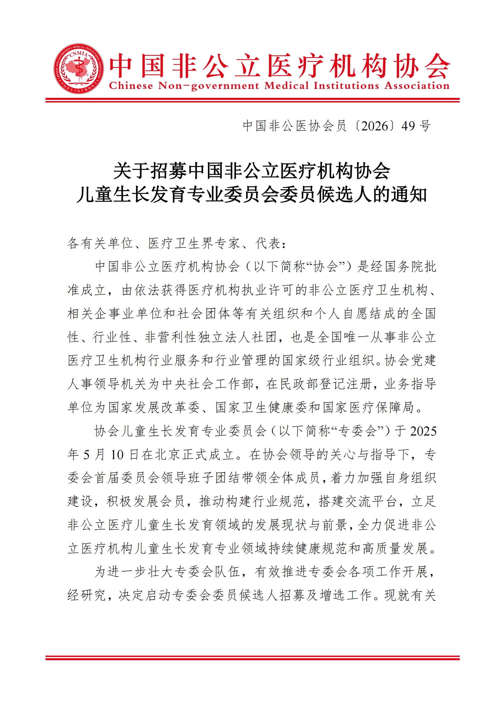 关于招募中国非公立医疗机构协会儿童生长发育专业委员会委员候选人的通知