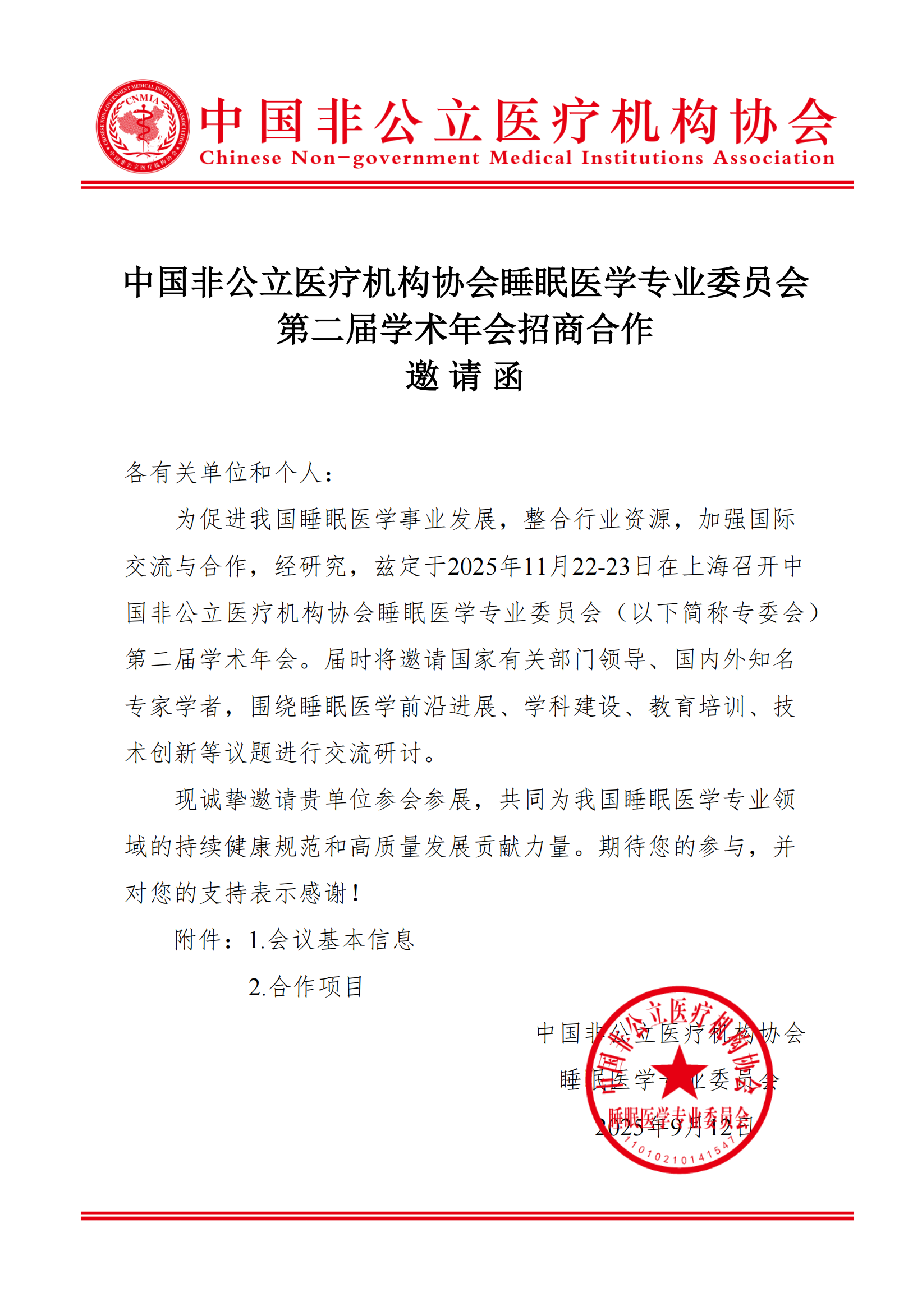 合作邀请函丨中国非公立医疗机构协会睡眠医学专业委员会第二届学术年会招商合作邀请函
