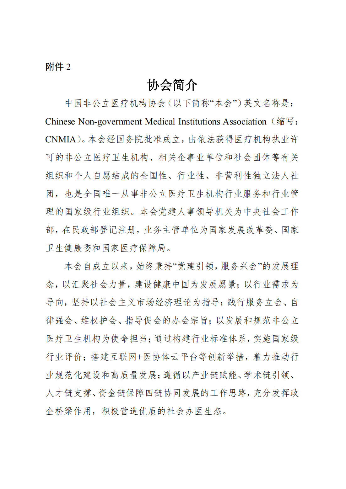 中国非公立医疗机构协会是由依法获得医疗机构执业许可的非公立医疗机构、相关企事业单位和社会团体等有关组织和个人自愿结成的全国性、行业性、非营利性社会组织。更多>>