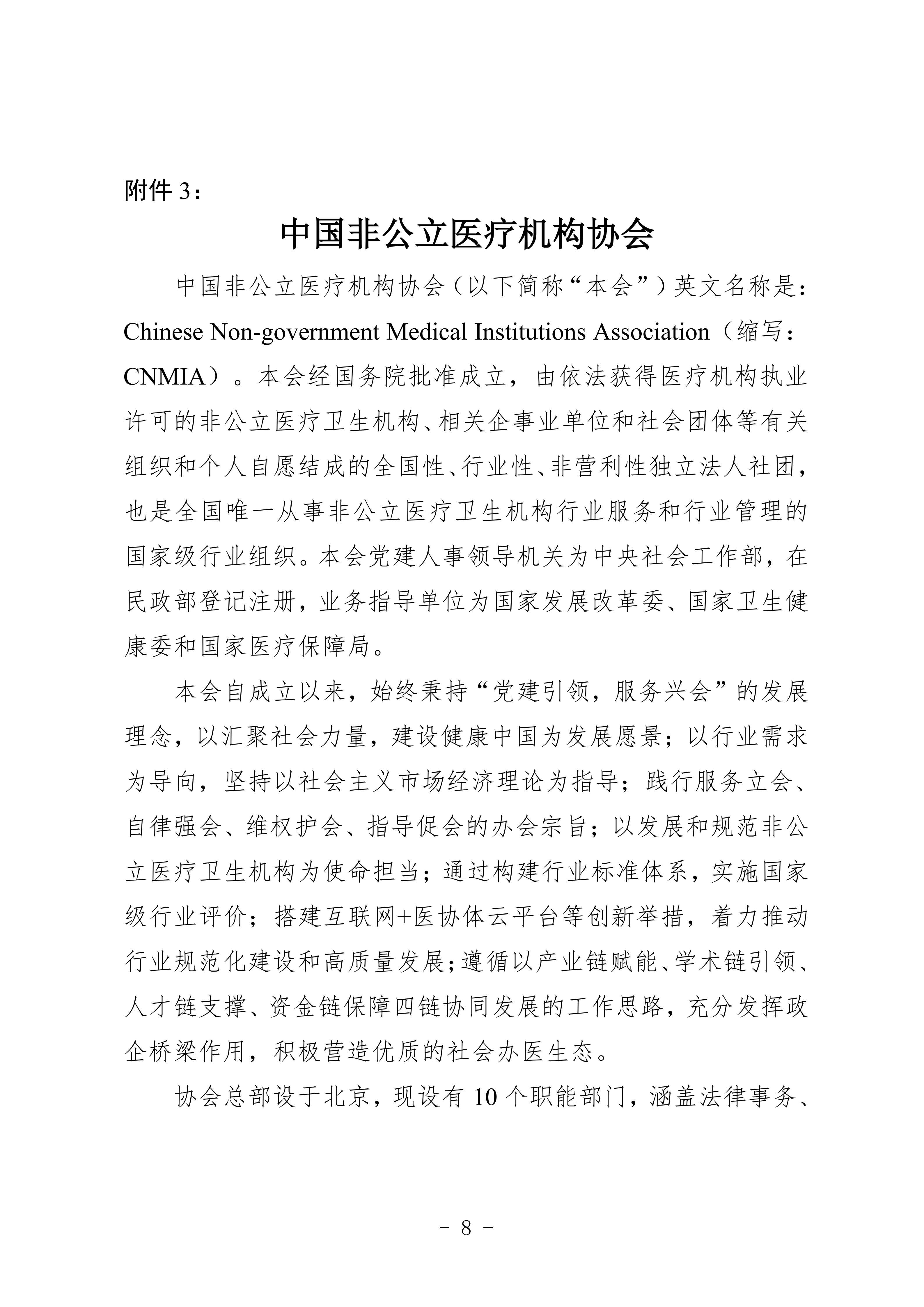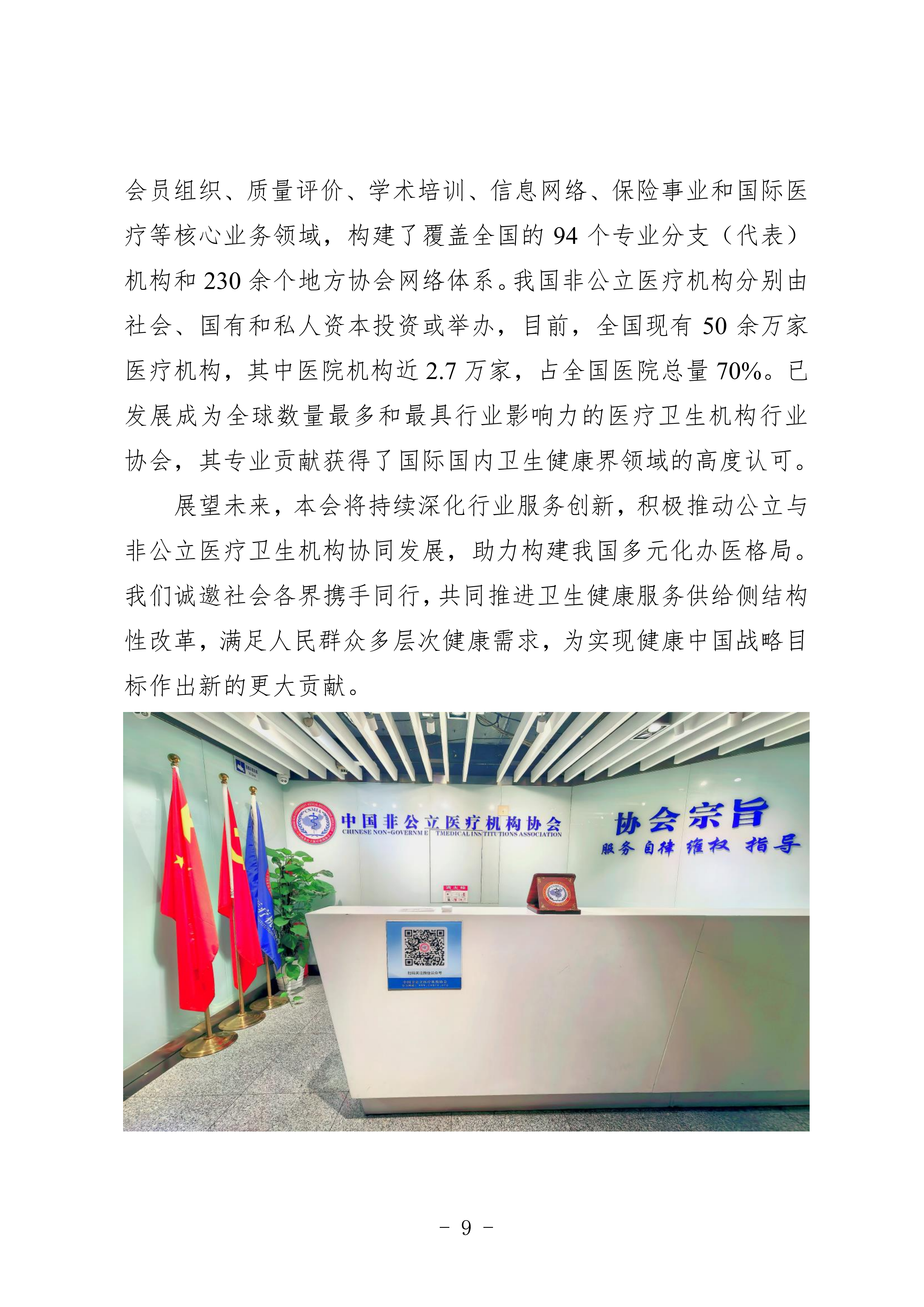 中国非公立医疗机构协会是由依法获得医疗机构执业许可的非公立医疗机构、相关企事业单位和社会团体等有关组织和个人自愿结成的全国性、行业性、非营利性社会组织。更多>>