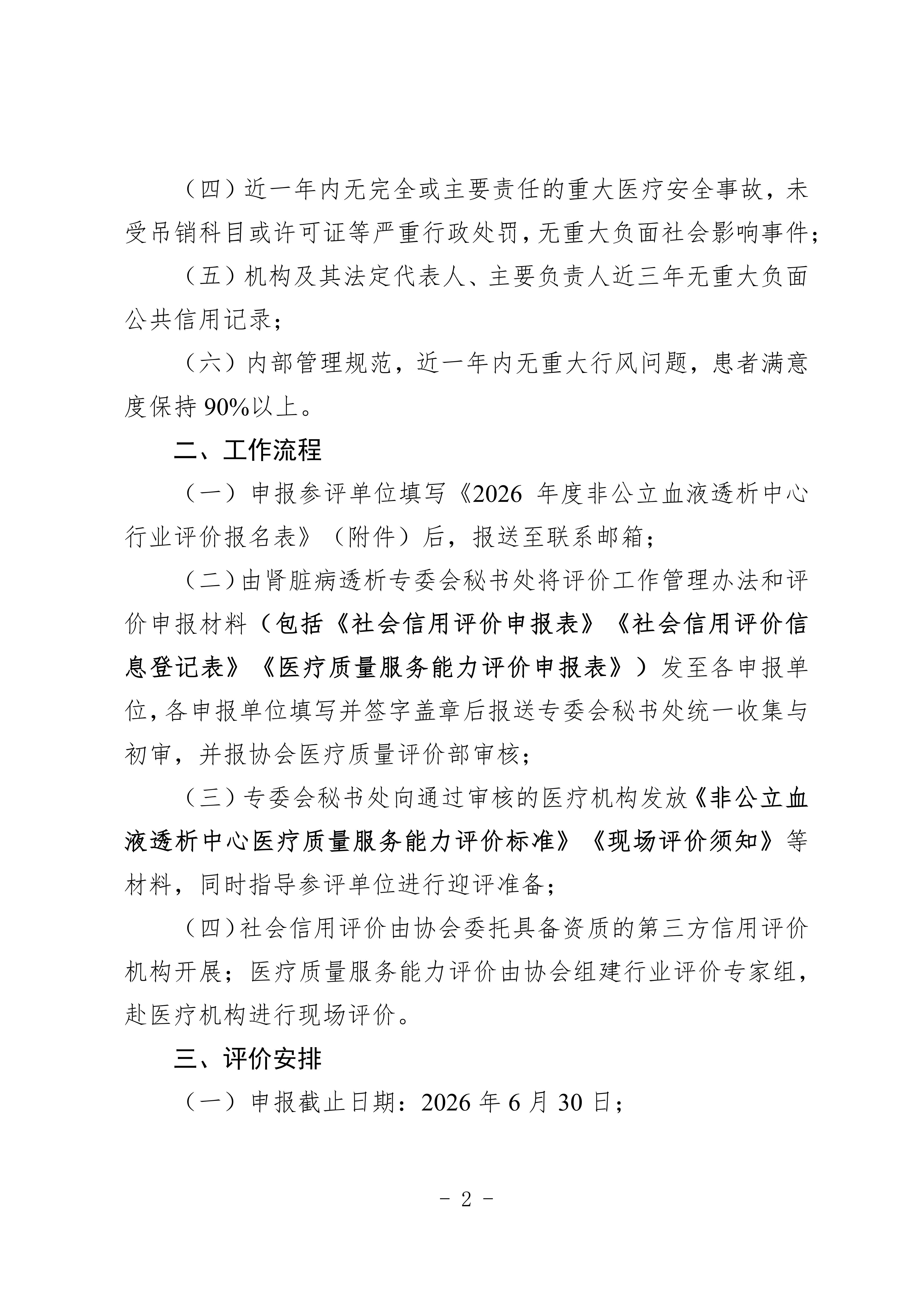 为贯彻落实国家卫生健康委等十部门《关于促进社会办医持续健康规范发展的意见》(国卫医发〔2019〕42号)精神,依据《原国家卫生计生委关于印发血液透析中心基本标准和管理规范(试行)的通知》(国卫医发〔2016〕67号)、中国非公立医疗机构协会(以下简称协会)《社会信用评价管理办法》《医疗质量服务能力评价管理办法》(中国非公医协〔2025〕267号)等相关规定,引导和推动非公立血液透析中心加强规范化建设、提升服务能力、树立行业品牌,实现高质量发展,协会现正式启动2026年度行业评价工作。现将有关事项通知如下: