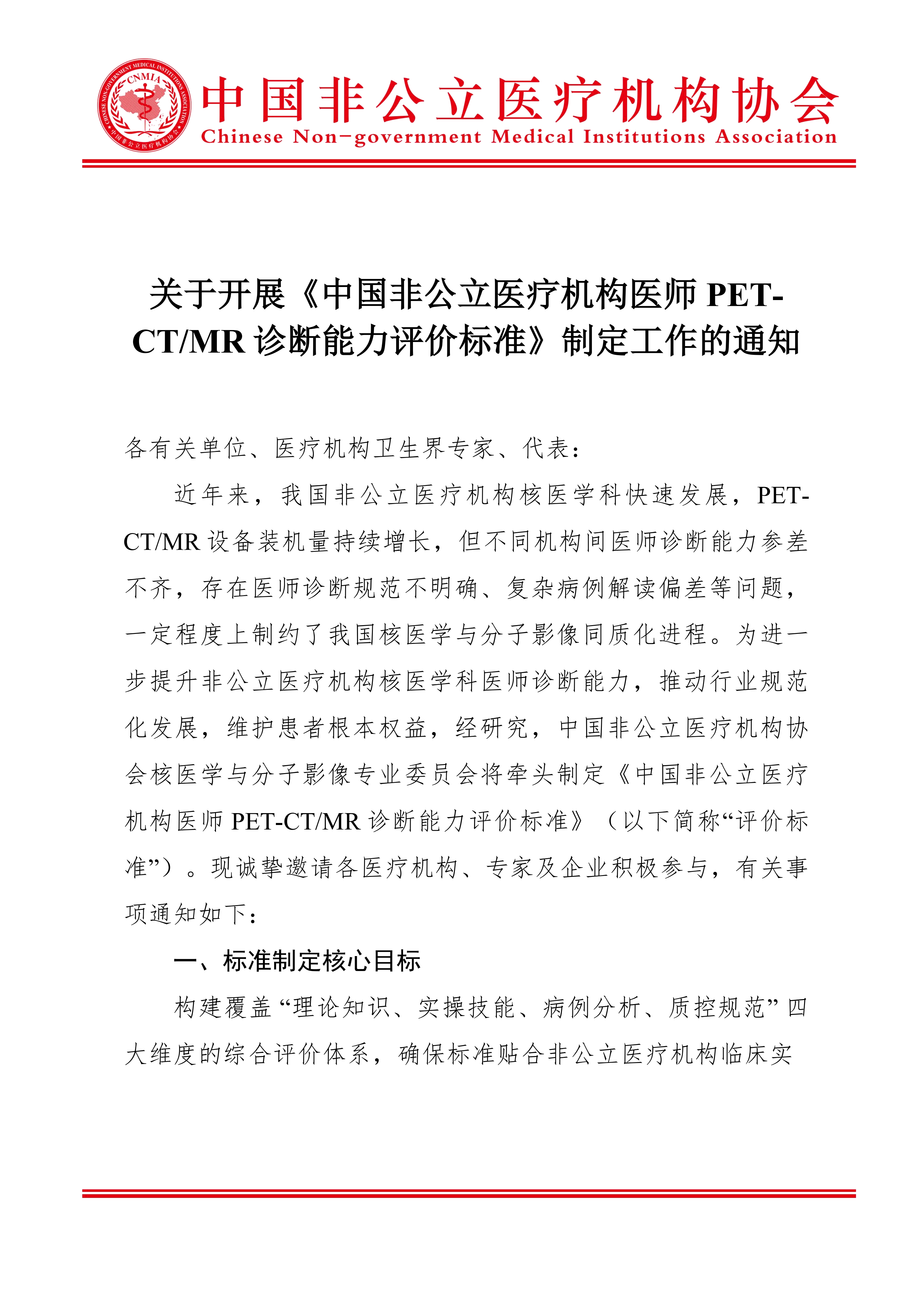 行业标准丨关于开展《中国非公立医疗机构医师PET-CT/MR诊断能力评价标准》制定工作的通知