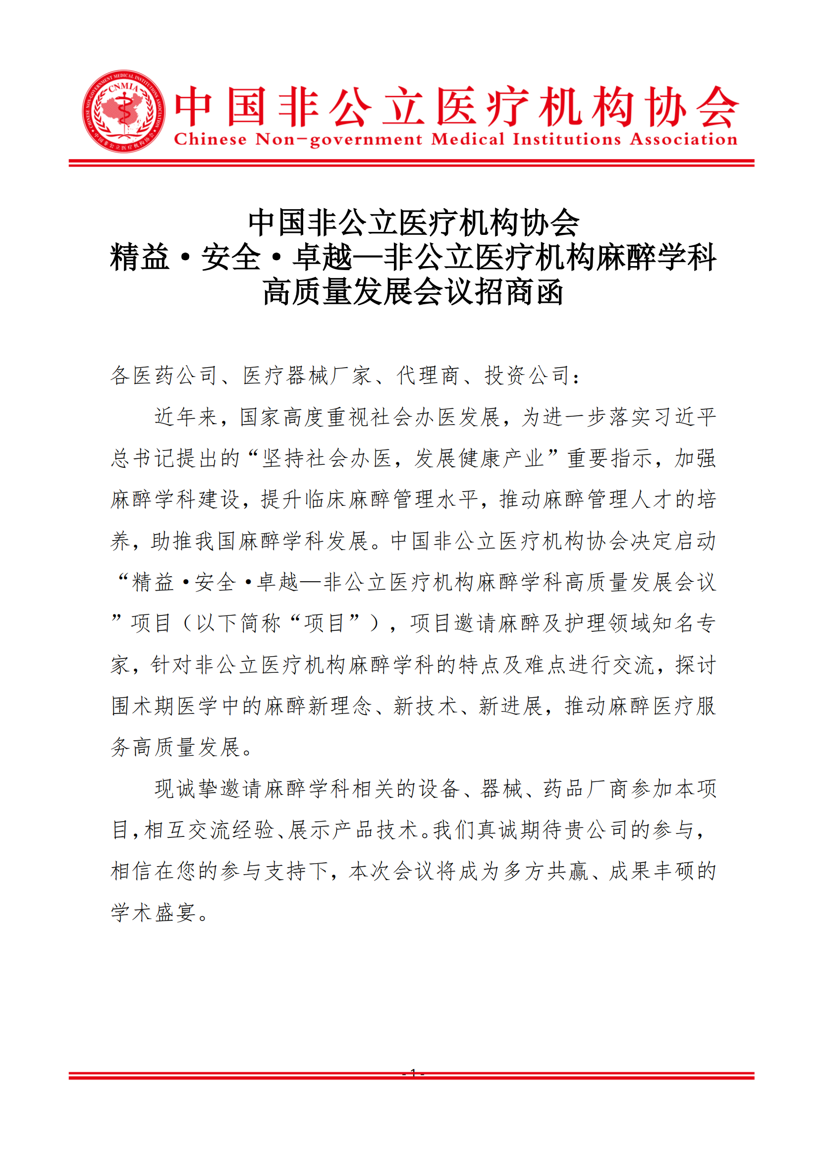 商务邀请函丨中国非公立医疗机构协会精益·安全·卓越—非公立医疗机构麻醉学科高质量发展会议招商函