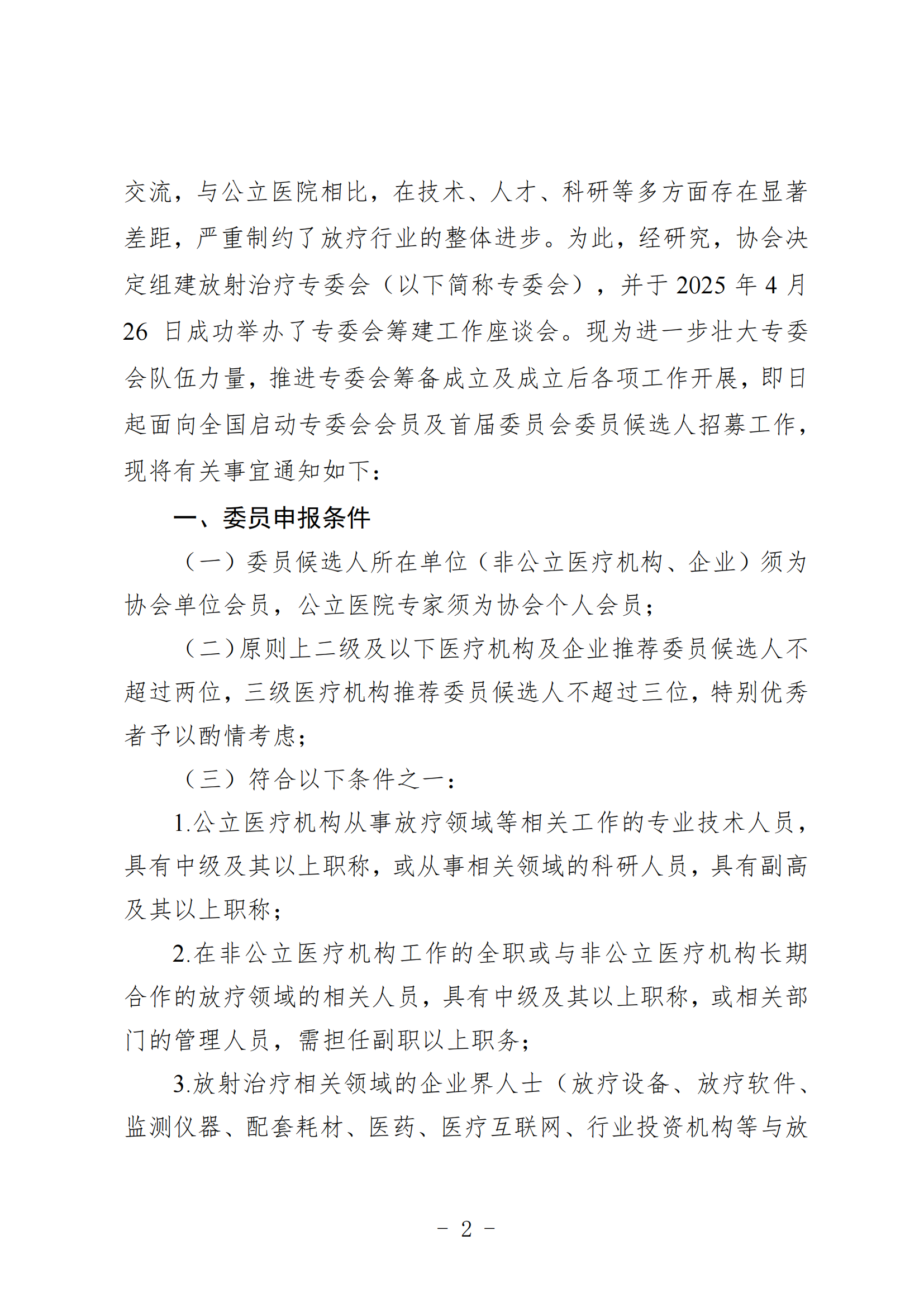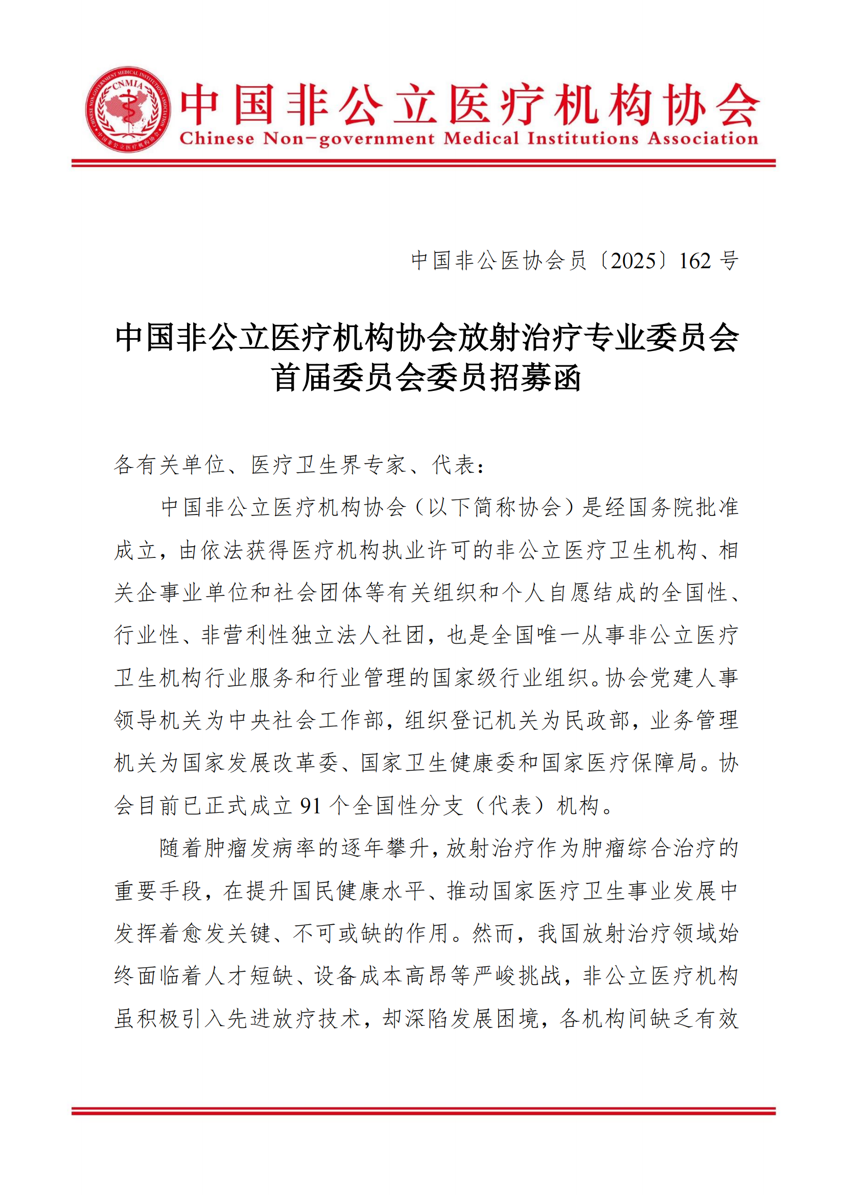 中国非公立医疗机构协会放射治疗专业委员会首届委员会委员招募函