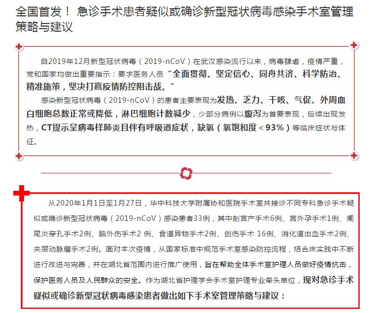 在新型冠状病毒感染疫情肆虐的危急情况下, 武汉多家医院手术室接诊不同专科急诊手术疑似或确诊新型冠状病毒感染患者,随着疫情的发展,武汉外科系统也要面临严峻的压力。