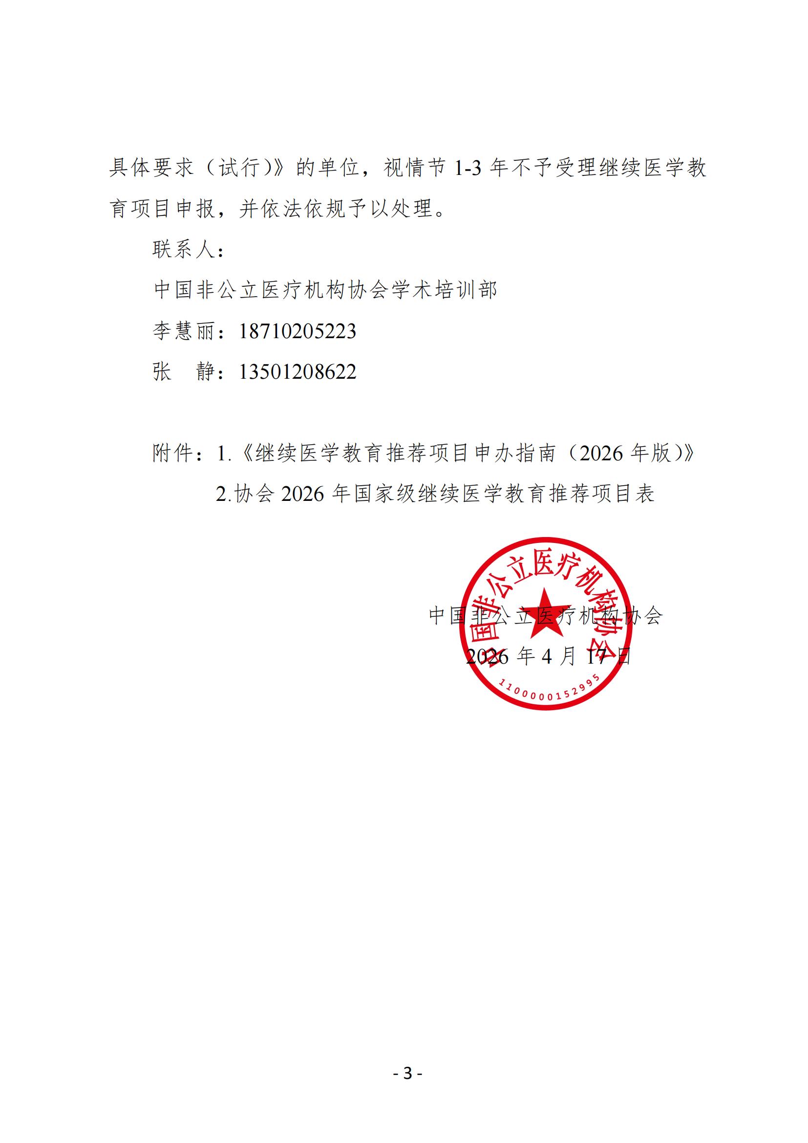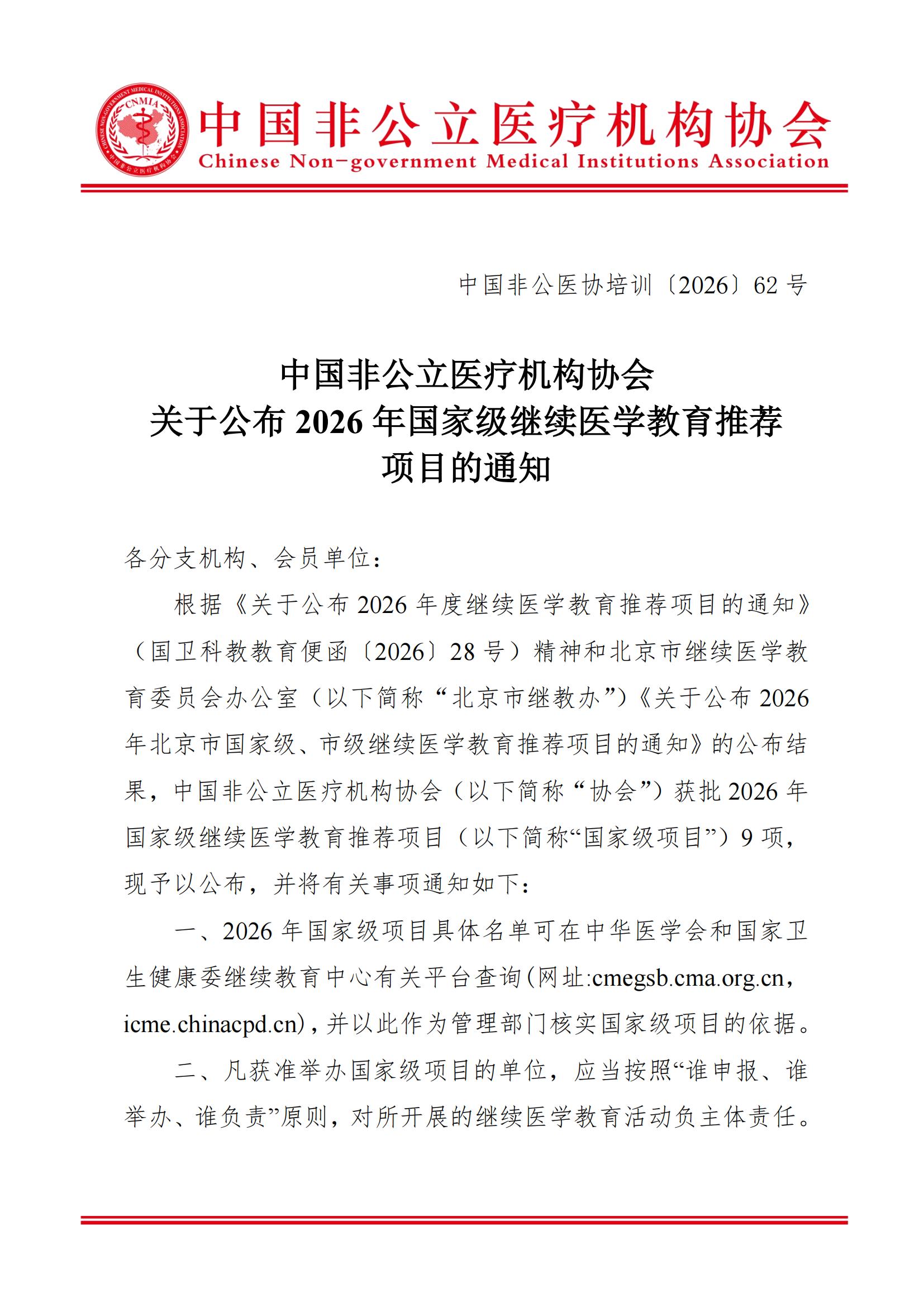 中国非公立医疗机构协会关于公布2026年国家级继续医学教育推荐项目的通知
