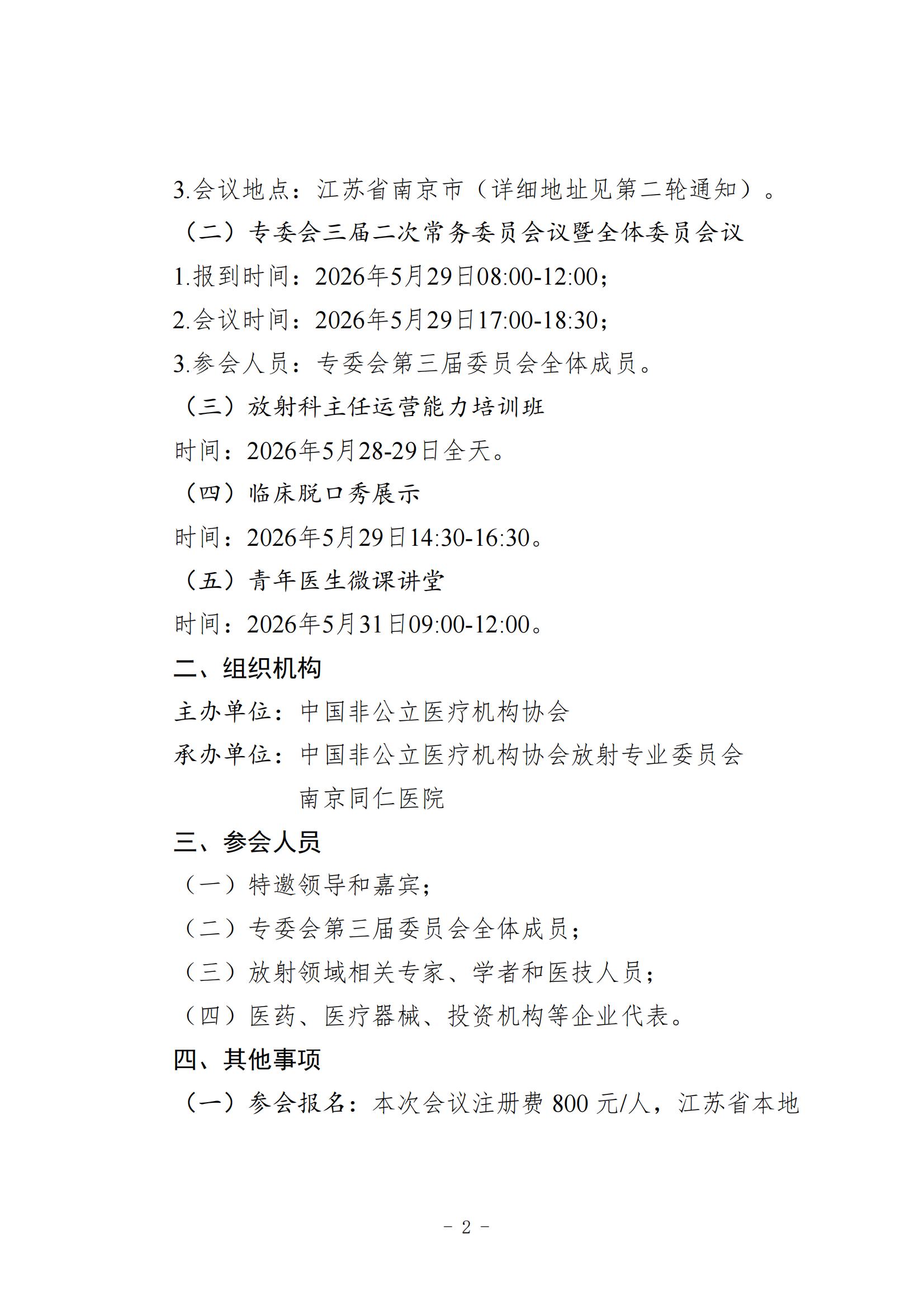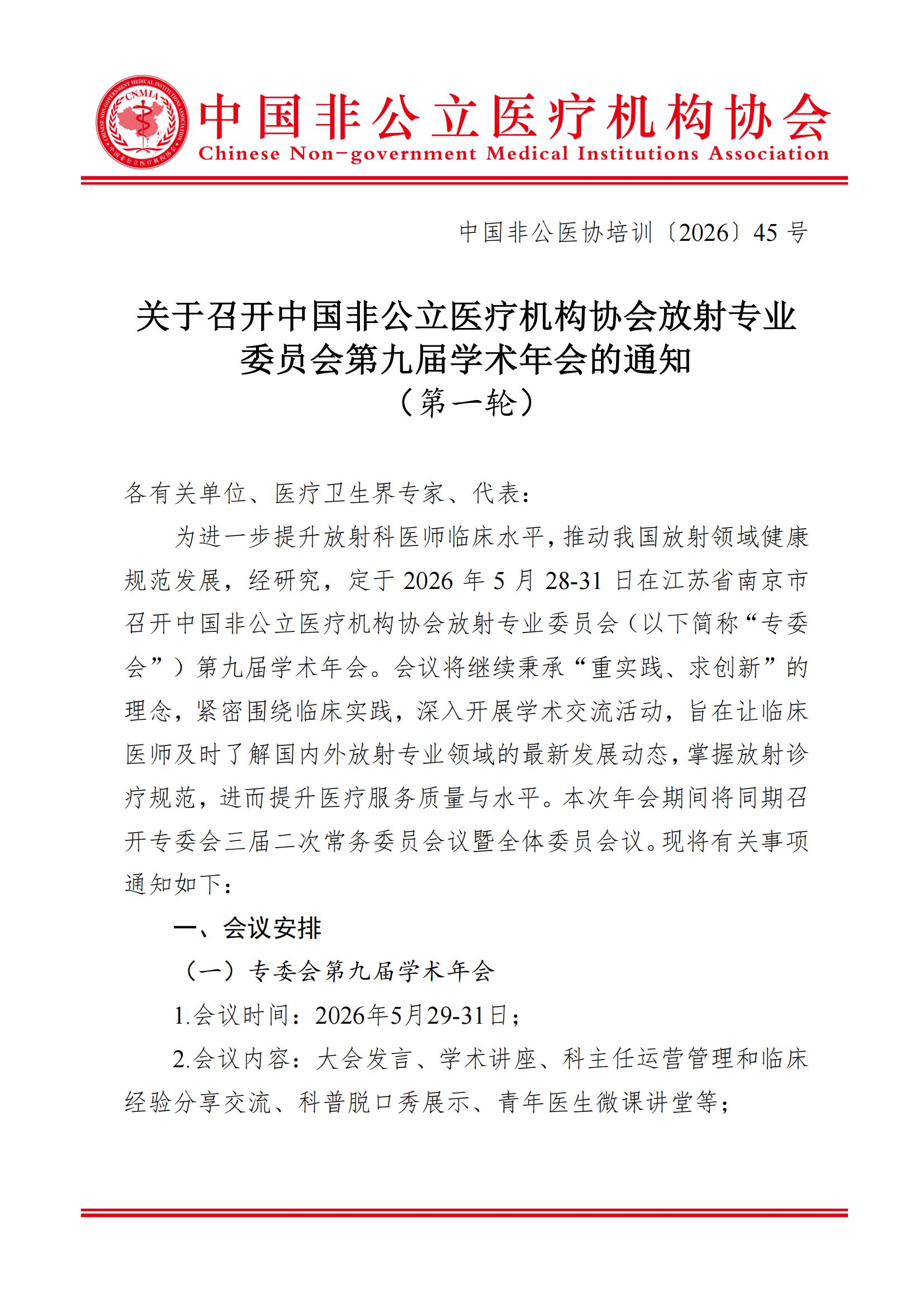 为进一步提升放射科医师临床水平,推动我国放射领域健康规范发展,经研究,定于2026年5月28-31日在江苏省南京市召开中国非公立医疗机构协会放射专业委员会(以下简称“专委会”)第九届学术年会。会议将继续秉承“重实践、求创新”的理念,紧密围绕临床实践,深入开展学术交流活动,旨在让临床医师及时了解国内外放射专业领域的最新发展动态,掌握放射诊疗规范,进而提升医疗服务质量与水平。本次年会期间将同期召开专委会三届二次常务委员会议暨全体委员会议。现将有关事项通知如下: