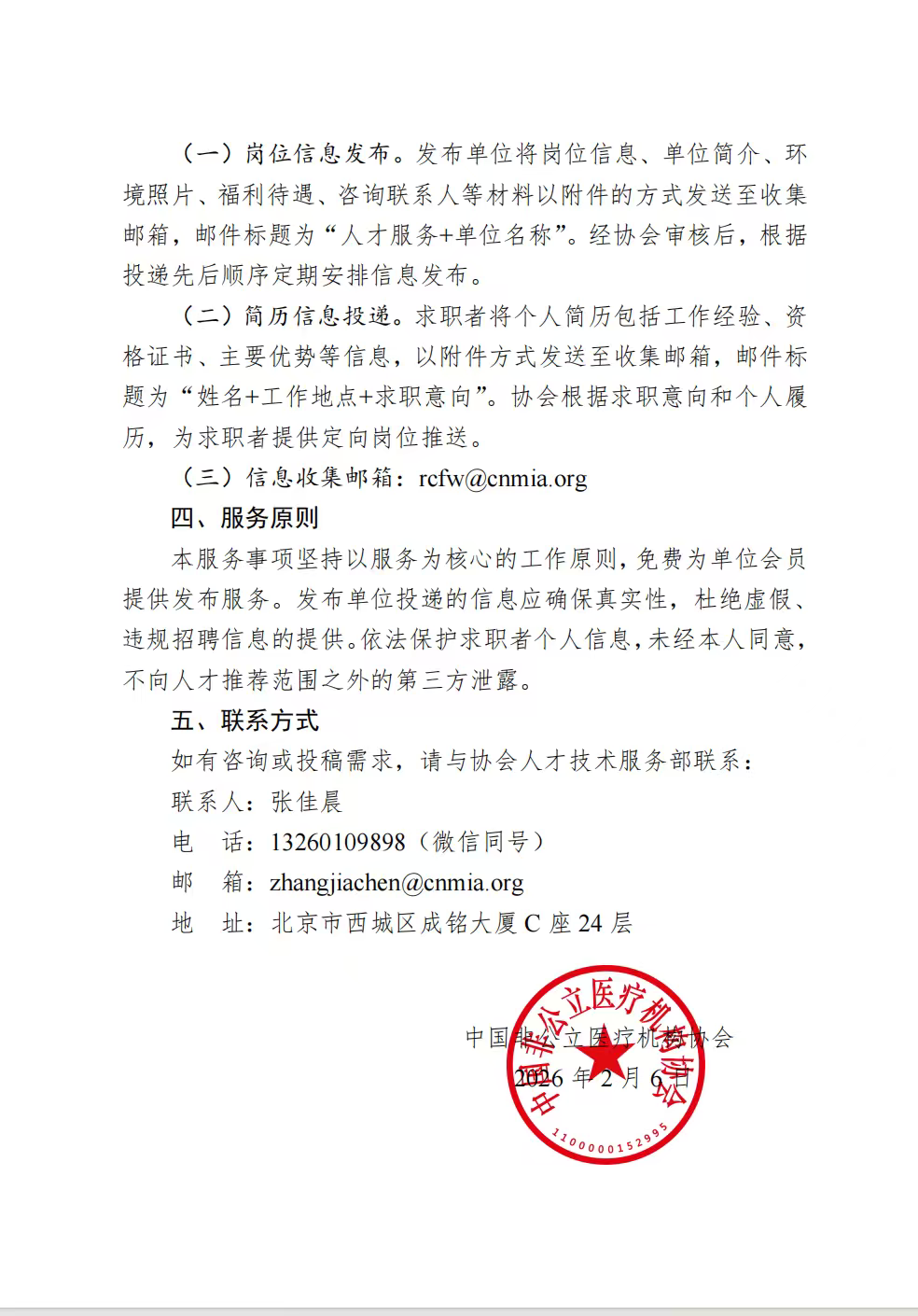 近年来,行业对各类专业人才的需求持续增长,然而,在人才引进过程中尚存在信息发布渠道分散、招聘效率不高、优质人才匹配困难等问题。部分求职者也缺乏权威、集中、可信的平台获取行业招聘信息。中国非公立医疗机构协会(以下简称“协会”)将通过协会官方微信公众号“中国非公立医疗机构协会”及官网“https://www.cnmia.org”开展公益性的人才服务事项,助力解决人才供需信息不对称、招聘渠道不畅通等实际问题,进一步丰富会员服务维度。现将有关服务事项通知如下:
