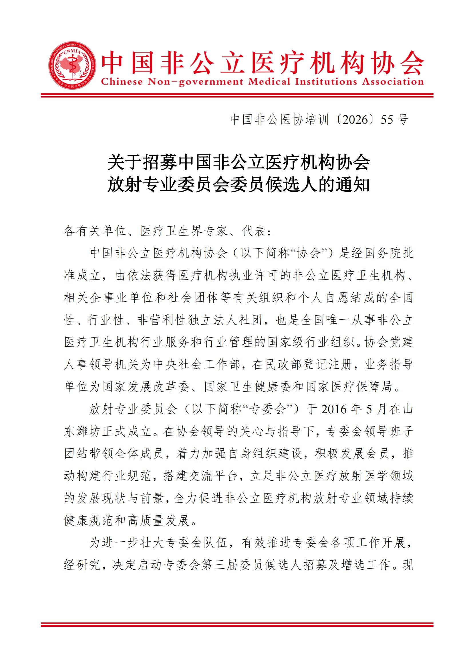 关于招募中国非公立医疗机构协会放射专业委员会委员候选人的通知