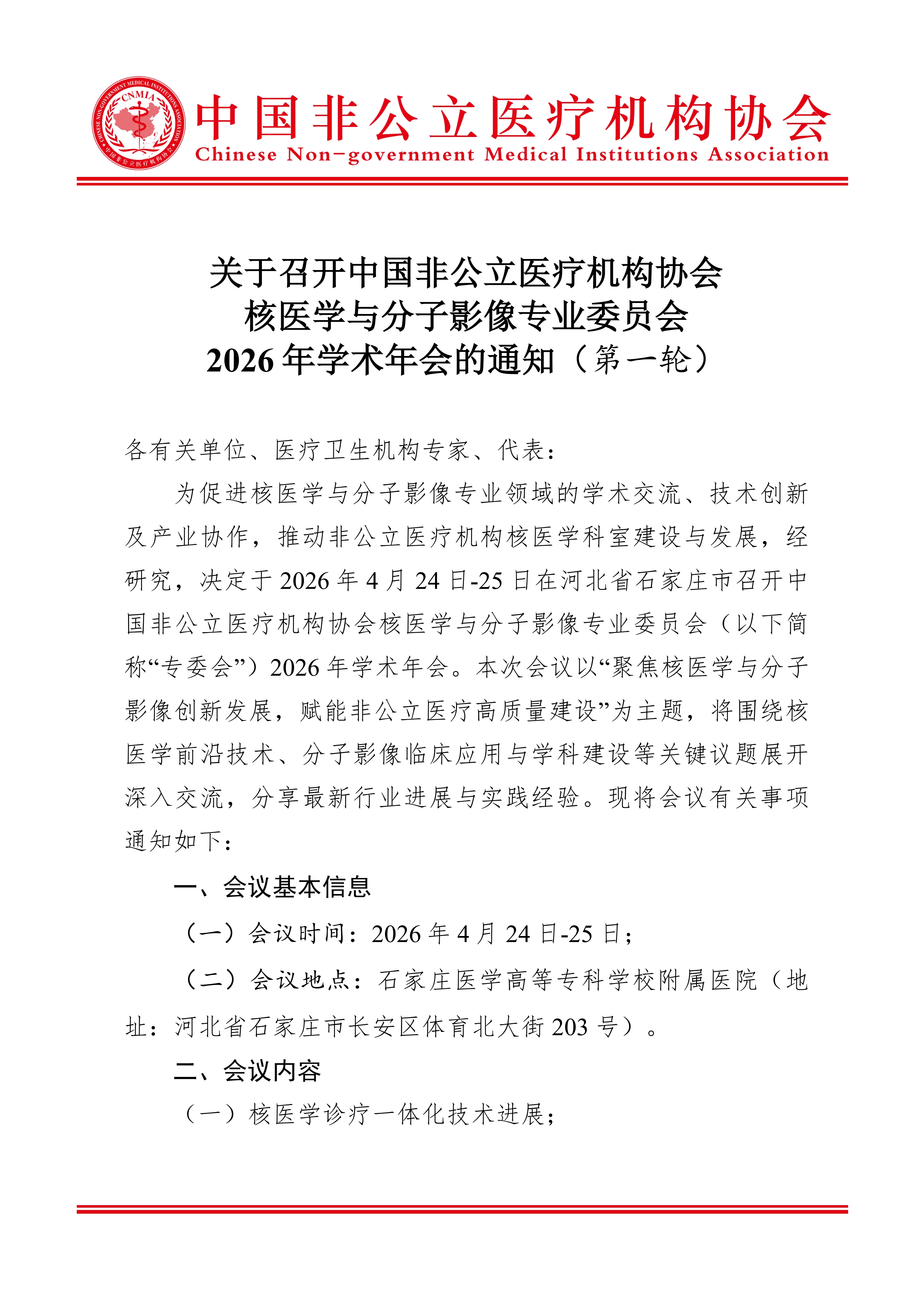 关于召开中国非公立医疗机构协会核医学与分子影像专业委员会 2026年学术年会的通知(第一轮)